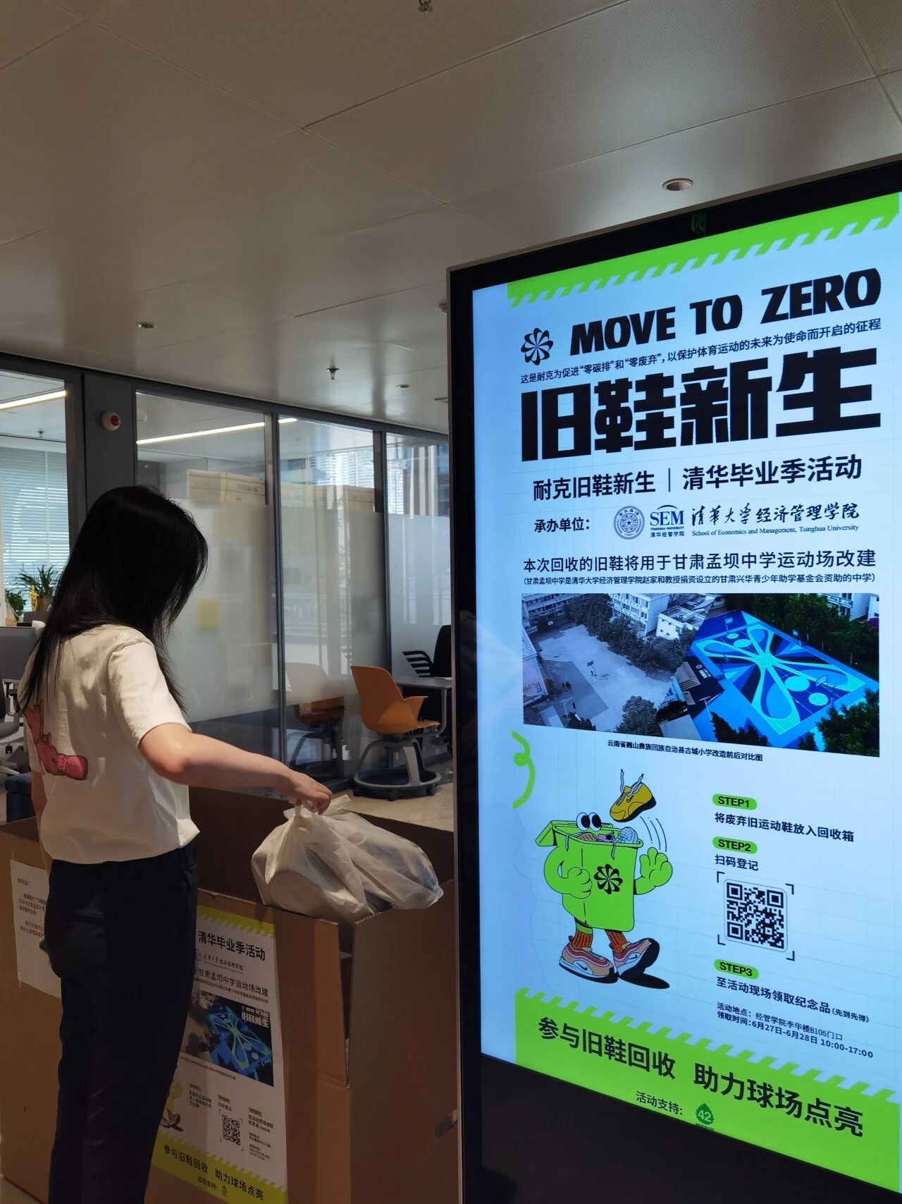 2024年清华毕业季耐克“旧鞋新生”活动,面向全体师生回收废旧运动鞋,回收超过1500双旧鞋,创旧鞋新生项目高校回收活动最高记录。回收的旧鞋经Nike Grind技术加工后用于建造孟坝中学环保运动场,每一双旧鞋都成为运动场的一部分。