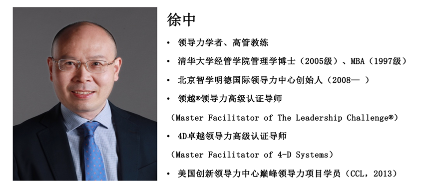 徐中博士曾任清华经管学院高管培训中心常务副主任(2003-2008)、知名高科技创业企业总经理、大型上市公司团委书记(最年轻中层干部),中国最早获得数千万风险投资的创业家之一(1999),荣获共青团中央第一届大学生创业计划大赛金奖(1999),拥有30年余在大型上市公司、高科技创业企业、清华经管学院、智学明德国际领导力中心等单位的管理经验。