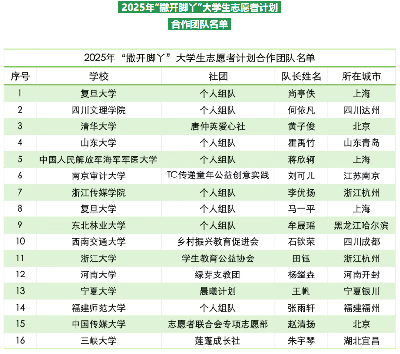 清华大学学生唐仲英爱心社“清心童趣”实践支队为2025年入选“撒开脚丫”夏令营的16支团队之一。