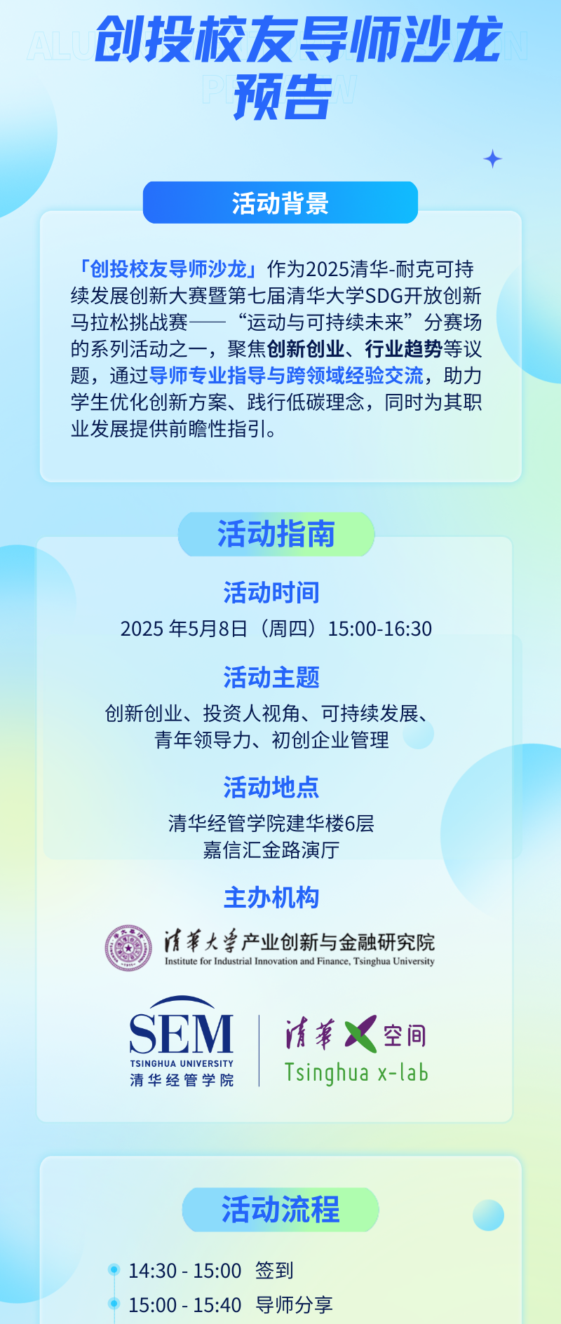为了应对气候变化、社会责任和治理等方面的挑战,ESG (Environmental, Social, and Governance)日益重要,已经成为评价机构的重要维度和未来领导者必备的理念和技能。在全球范围内,可持续发展已成为很多机构的核心战略和运营的有机组成部分,该项目正是基于这样的背景应运而生。项目致力于构建一个充满活力、紧密相连且开放包容的社群。在清华大学吸纳具备创新思维和领导潜质的清华学子加入社群,通过跨学科、整合式和项目式学习,量身定制的研究和创新支持,以及丰富多彩的社群活动,培养学生可持续发展的思维理念,提升全球胜任力、本土洞察力和系统思辨力,磨练变革领导力和变革管理技能,拓展专业人脉网络,使学生能够将可持续发展作为日常学习、思考和生活的核心价值,并能够采用综合、系统的方法解决可持续发展的实际问题,未来成为推动可持续发展的领军人物。