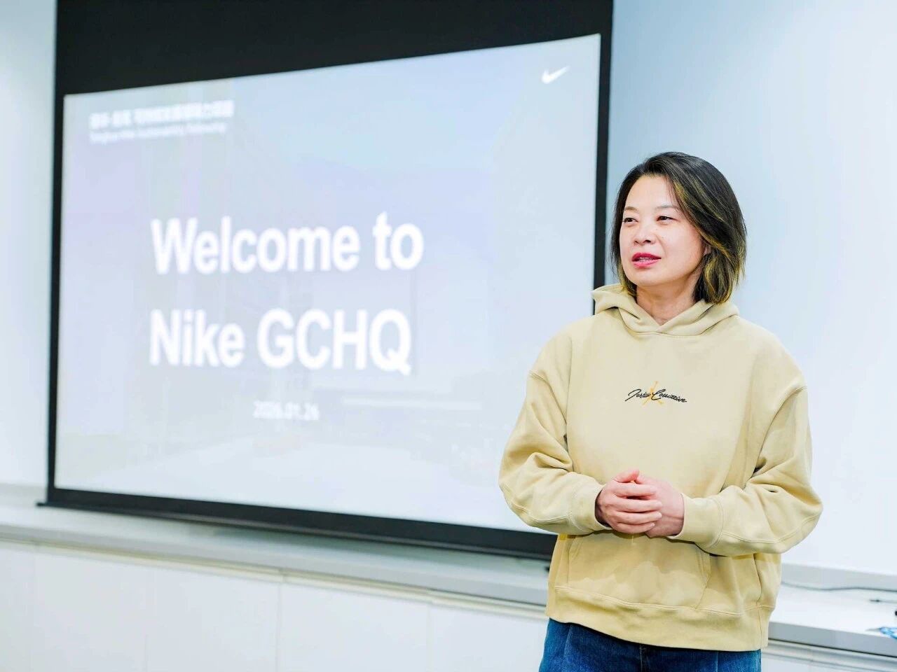师生一行首站抵达耐克大中华区总部,开启了对跨国企业可持续发展的探索。郦金梁表示,希望同学们通过与行业领袖的对话,深化学术视野,将商业可持续发展的核心理念内化于心,为未来投身各领域的社会实践提供持续的启发与思考 。耐克大中华区公益部负责人许琳欢迎同学们的到来,并寄语同学们“只要你拥有身体,你就是一名运动员”(If you have a body, you are an athlete),鼓励每位同学在人生各个赛道上勇于挑战、保持专业精神,以运动员的韧劲探索人生无限可能。