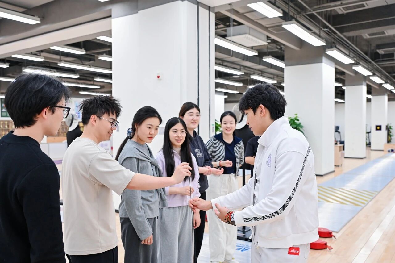 随后,在各位教练的分组指导下,同学们穿戴护具、持剑上手,从基本站姿、握剑手法到简单攻防动作反复练习,在一来一回的交锋中体会专注判断与快速反应的乐趣。大家在安全有序的氛围中沉浸式体验击剑的优雅与力量,既锻炼了身体协调性,也在互动切磋中增进了交流。